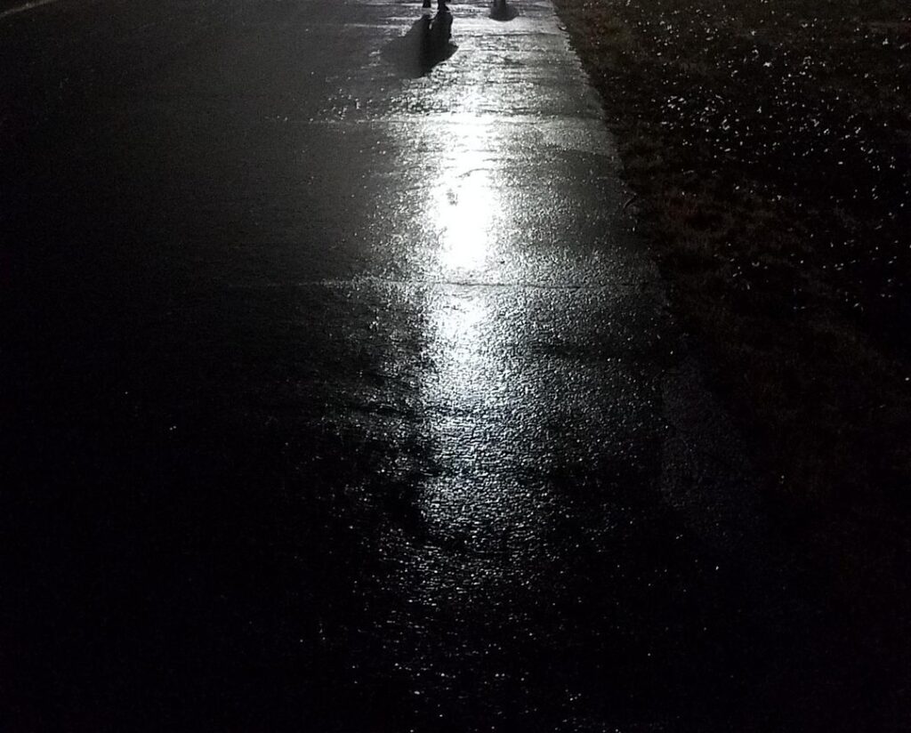 little one flees through the shattered doorway runs down the middle of the street in the middle of the night bare feet slapping cooled asphalt he is screaming out for help for someone